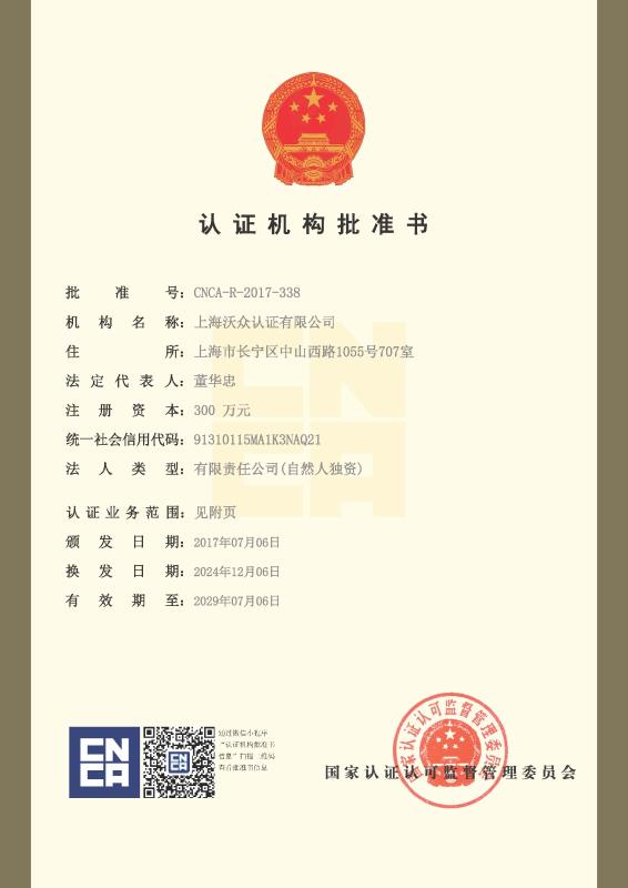 上海沃眾認證有限公司于2017年由國家工商管理局批準成立,并由中國國家認證認可監(jiān)督管理委員會(CNCA)批準設立(批準號:CNCA-R-2017-338)的認證機構,坐落在上海市長寧區(qū),從事(ISO9001)質(zhì)量管理體系認證、(ISO14001)環(huán)境管理體系認證、(ISO45001)職業(yè)健康安全管理體系認證和(GB/T27922)商品售后服務評價體系認證。在未來發(fā)展的道路上,將會把標準研發(fā)、標準技術信息提供和管理體系認證服務集于一體,成為最大的國際標準管理體系認證服務機構之一。同時也將走出中國,踏上國際…